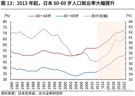 早在2000年,日本便修改《安定法》,提出了企业有义务努力实现雇佣员工到 65 岁,并且提出了雇佣确保措施的努力义务化。2004年,明确规定用人单位必须确保对65岁以下老年人的雇佣。此后60-64岁就业率开始触底回升,但上升幅度较低。随着2013年日本将65岁延迟退休确定为企业义务化之后,60-64岁人口就业率快速上行。2022年,60-64岁人口就业率达到73%,远高于2012年的57.7%。同期65-69岁人口就业率也明显提升,自2012年的37.1%提升至2022年的50.8%。