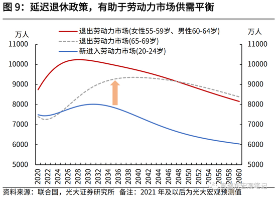 此外,考虑到2020-2030年,退休人口数量快速上升,而新进入劳动市场人口(20-24岁)增长缓慢,若退休人口延后退出劳动力市场,有助于阶段性维持劳动力市场供需平衡。