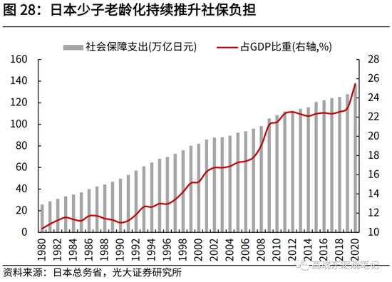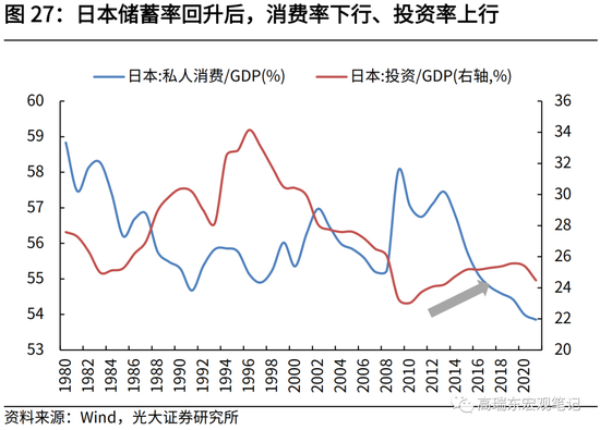 1998年之后,日本15-65岁劳动年龄人口持续下降,人口老龄化加速,使得劳动参与率也随之回落。老龄化程度的加深,导致此后日本消费增速走低、储蓄率下行、投资率回落。