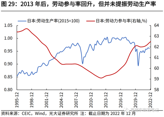 此外,日本延迟退休后,劳动参与率的回升,并未提振日本劳动生产率。2013年-2017年,日本劳动生产率稳定在高位,2018年之后逐步回落。