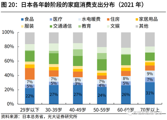 从消费倾向来看,青壮年群体由于养老负担、税负加重,消费倾向普遍性回落,尤其是29岁以下家庭,其消费倾向回落速度最快。而老年群体由于收入得以保障、消费刚性支出占比较高,消费倾向相对稳定。例如,2021年,70岁以上家庭中,食品、水电暖费、医疗等刚性支出占比达到47%,远高于同期29岁以下家庭刚性支出占比34%。因此,随着老龄化程度的加深,70岁以上家庭的消费倾向呈现上升趋势。