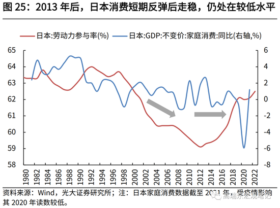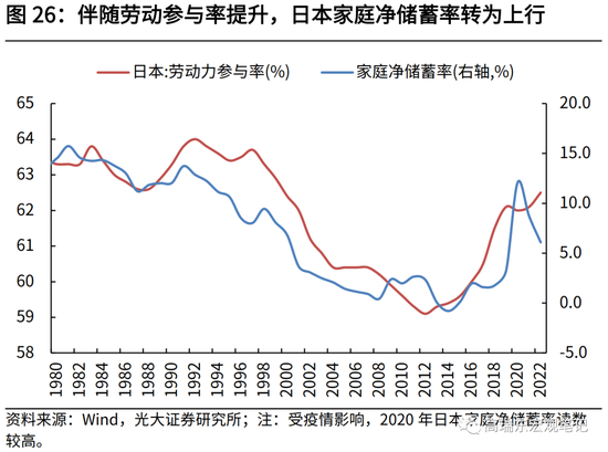 1998年之后,日本劳动年龄人口持续下降,人口老龄化加速,劳动参与率随之回落,此后日本消费增速走低、储蓄率下行、投资率回落。2013年,日本将延迟退休至65岁规定为企业义务化,此后老年群体就业意愿明显增加,劳动参与率触底回升。