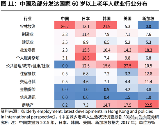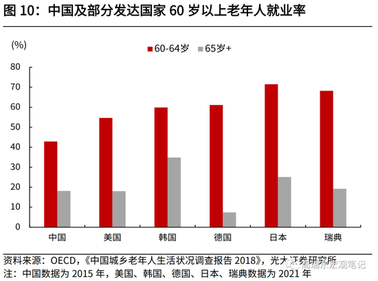 其次,对比国内外情况,我国老年人就业意愿较低,就业行业多集中于农林牧渔业,基本处于闲暇状态。从就业率看,根据OECD统计,2021年,在美国、韩国、德国、日本、瑞典,60-64岁人口就业率分别为54.7%、59.9%、61.1%、71.5%、68.2%。根据《中国城乡老年人生活状况调查报告(2018)》,2015年,我国60-64岁人口就业率仅为42.8%,远低于发达国家水平。从就业行业分布看,2015年,我国60岁以上人口就业中,有86.2%集中于农林牧渔业,服务业占比仅为6.5%。而2017年,日本、韩国、美国、新加坡,其60岁以上人口就业行业分布中,服务业占比分别为66.6%、63.7%、82.4%、87.1%。
