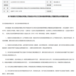 时间拉回到五天前。2月28日,证监会下发《关于核准东方证券股份有限公司吸收合并东方证券承销保荐有限公司暨变更业务范围的批复》(证监许可〔2023〕425号),进行了如下批示: