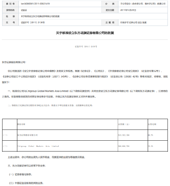 回想2011年12月,证监许可〔2011〕2136号批文,核准东方证券与Citigroup Global Markets Asia Limited(简称:花旗亚洲)共同出资设立东方花旗证券有限公司(下称:东方花旗,即东方投行的前身)。