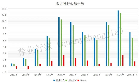 在2012年到2021年期间,业绩数据曾有起伏,但在2019年以来连续增长。除创立之初外,东方投行保持了年年盈利。