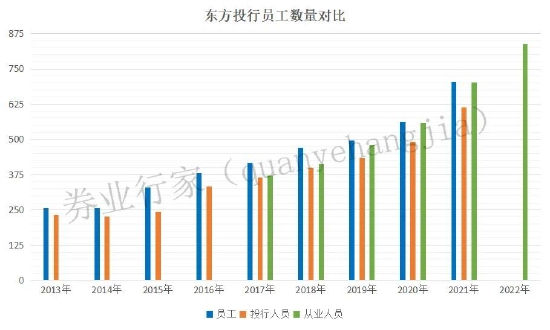 从历史数据来看,2013年东方投行首次披露了员工数据,共计257名,其中投行人员232名。而在2021年,东方投行有703名员工,其中投行人员614名。