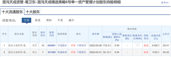 基金君还留意到,除了最新现身中宠股份,混沌天成资管-葛卫东-混沌天成精选策略6号单一资产管理计划,曾经还在2022年一季度末,出现在凯盛新材的前十大流动股东名单,持有32.12万股,持股市值为1120万元。但也仅仅持有一个季度就退出了。