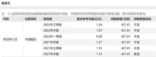 但是他的妹妹葛贵兰则是不一样的思路,从2021年二季度以后一直坚持持有中宠股份一年半的时间,而且一股没有卖,熬过了公司股价暴跌阶段,但是没想到今年3月披露时竟然退出了流通股东名单。
