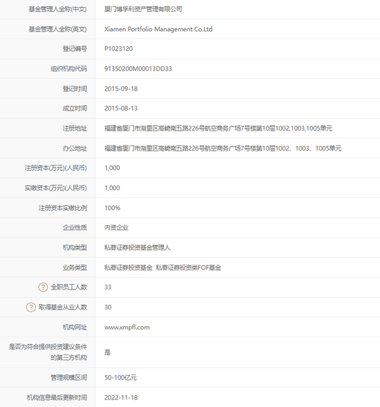 据中基协备案信息,博孚利资产成立于2015年8月,同年9月备案为证券投资类私募机构管理人。注册资本和实缴资本均为1000万元。现有33名员工,其中30名拥有基金从业资格;存续产品多达206只。