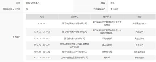 合规风控负责人蔡强,有多段任职经历,最长的一次是在华安证券厦门钟林路营业部任合规专员。