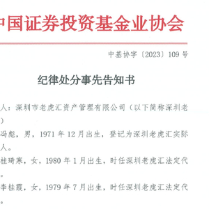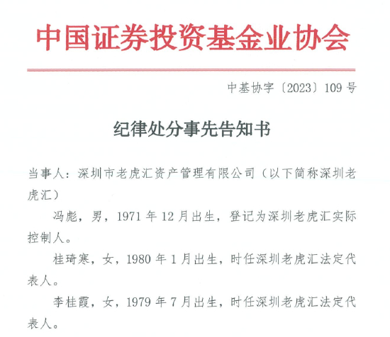 中国证券投资基金业协会(以下简称“中基协”)日前下发《纪律处分事先告知书》,将老虎汇的会员资格取消,并撤销了其管理人登记,同时还将老虎汇实控人冯彪加入黑名单,期限一年。
