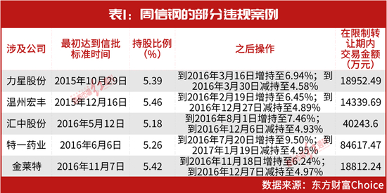 不过,就当市场以为周信钢会避免此类操作之际,其却在违规的道路上越走越远。在2015年~2017年期间,周信钢在多家上市公司的前十大流通股股东名单现身,这些公司普遍仍以小盘股为主,而在其中包括力星股份、温州宏丰、汇中股份、特一药业和金莱特等多家公司在内的操作中,再次出现类似美欣达的违规行为(见表1)。对此,深交所则再次对周信钢给予了公开谴责处分的决定。