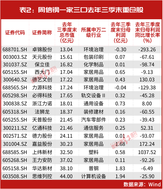 不过,与葛卫东等不同的是,周信钢的持股更为分散,且普遍为小盘股。如去年三季度末,仅周信钢一家三口就合计重仓了17家公司,而葛卫东和陈发树同期仅分别重仓了8家和7家。从市值来看,周信钢重仓的17家公司在当时的总市值均低于50亿元,其中卓锦股份、天元股份和保立佳等7家公司的总市值更是不足20亿元(见表2)。