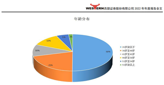 西部证券2022年报披露,35岁及以下员工占比为50.12%。据西部证券社会责任报告,2022年招录近500名员工,其中校园人才近100名;由陕西省人力资源和社会保障厅评选为“2022年全省就业创业先进集体”。