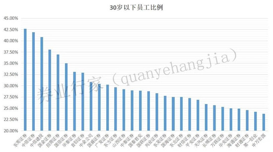 而从30岁以下员工占比来看,情况有很大不同。行家纳入统计的券商平均占比为29.69%,仅有11家券商占比超过这一数值。