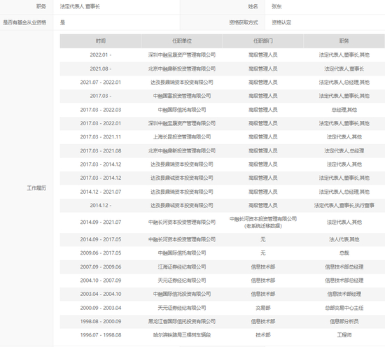 中融宝晟法定代表人、董事长张东,早年任职于天同证券。他曾在中融国际担任总裁,并在中融鼎新、中融宝晟等关联私募交叉任职。也因为其金融机构背景,“免考”认定基金从业资格。