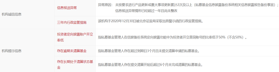 行家注意到,中基协对中融鼎新列示了多条红字提示,包括信息报送异常,北京证监局监管警示措施,投资者定向披露账户开立率低,存在逾期未清算基金,以及存在长期处于清算状态基金。而案涉的“白羊1号”,并没有显示为已清算。