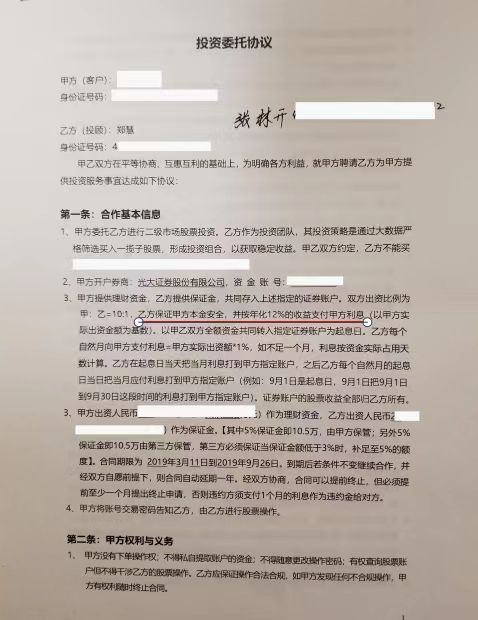具体来看,记者从投资者处独家获悉《投资委托协议》,甲方为投资者,乙方为自然人,名叫郑慧。该协议提到,“甲方委托乙方进行二级市场股票投资,乙方作为投资团队,其投资策略是通过大数据严格筛选买入一揽子股票,形成投资组合,以获取稳定收益”。