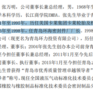 从中可以看出,张万明在大学毕业后即投身业界。从1991年到1995年,历任历任美国卡莱集团卡莱轮胎及橡胶公司技术部、厂务部经理;从1995年至1998年,任青岛环海密封件厂厂长。