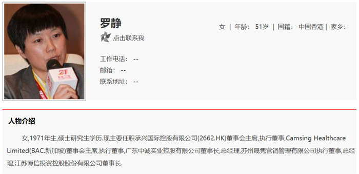 据华夏时报此前报道,罗静生于1971年,为中国香港籍,案发时她同时控制着A股上市公司博信股份(600083.SH)、港股上市公司承兴国际控股有限公司和新加坡上市公司Camsing Health care Limited。她也是国内商界女性领袖俱乐部木兰汇的成员,曾多次获得“商界木兰”称号。