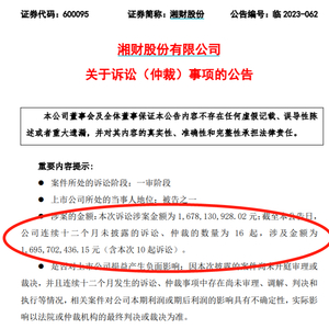 在诉讼、仲裁的细节方面,湘财股份指出,子公司湘财证券于近日收到江苏省南京市中级人民法院送达的(共计10起案件)起诉状、举证通知书等文件,涉案金额为1,678,130,928.02元。