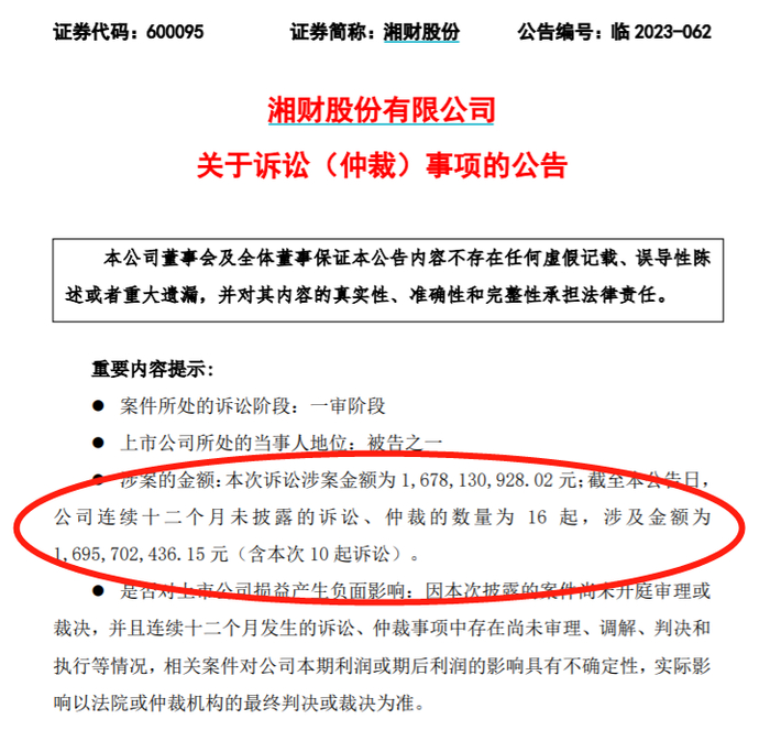 湘财股份发布的《关于诉讼(仲裁)事项的公告》显示,公司连续12个月未披露的诉讼、仲裁的数量为16起,涉及金额为1,695,702,436.15元(含本次10起诉讼)。公司是这些诉讼、仲裁的被告之一,案件诉讼处于一审阶段。