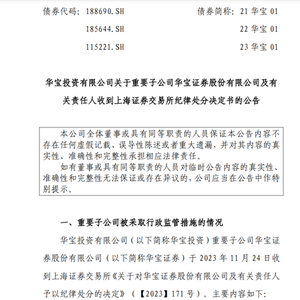 11月28日,华宝投资有限公司(下称“华宝投资”)宣布旗下重要子公司华宝证券股份有限公司(下称“华宝证券”)及相关责任人收到上海证券交易所纪律处分决定。