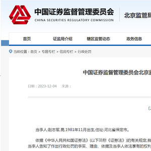 北京证监局称,赵志军使用“杨某勤”证券账户买卖股票的行为,违反《证券法》第四十条第一款的规定,构成《证券法》第一百八十七条所述违法行为。不过,北京证监局也表示,赵志军能够主动配合调查,因此根据当事人违法行为的事实、性质、情节与社会危害程度,对赵志军处以10万元的罚款。