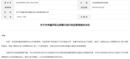 下发于今年11月29日,编号为〔2023〕79号的监管处罚函指出,当事人李鑫在国金期货任职期间,接受客户电话委托下达交易指令,未遵守岗位执业行为规范,违反了《期货从业人员管理办法》第十四条的规定。