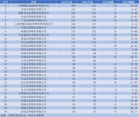 在证券分析师数量方面,中金公司以299名居首,同比增幅高达36.08%。其次是中信证券(182)、国泰君安(161)、兴业证券(155)和广发证券(147);申万宏源旗下的上海申银万国证券研究所有限公司(简称:申万研究所)为144名;华泰证券、海通证券、中信建投、国金证券、长江证券、浙商证券、国信证券、招商证券分析师数量均超过百名。