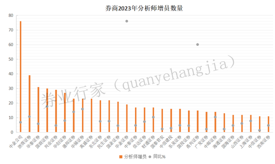 从分析师增员数量来看,中金公司净增76名;浙商证券、华泰证券、国联证券、兴业证券和华创证券分别净增39、31、30、29和27名;两家外资券商高盛证券和瑞信证券从0起步,全年增员分别为23名和10名。长江证券、西部证券和东亚前海证券分析师数量减少11、9、6名。而在中位数以上的券商中,华金证券、甬兴证券和申港证券,分析师增员比例分别为380%、300%和200%。