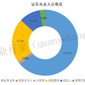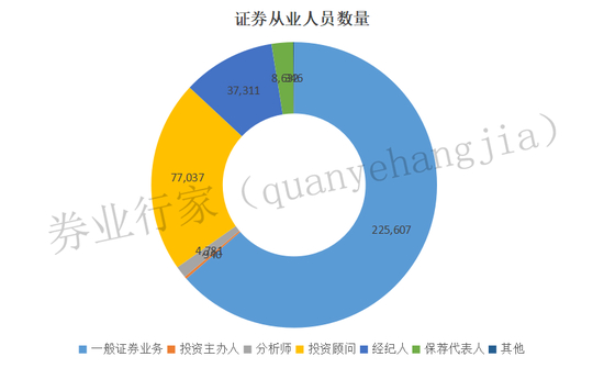 来自中国证券业协会的数据显示,截至2023年12月31日,142家券商(含单列的资管子公司)共有354,654名从业人员。其中有225,607名一般证券业务人员,77,037名投资顾问,37,311名证券经纪人,8,632名保荐代表人,4,781名证券分析师和940名投资主办人。
