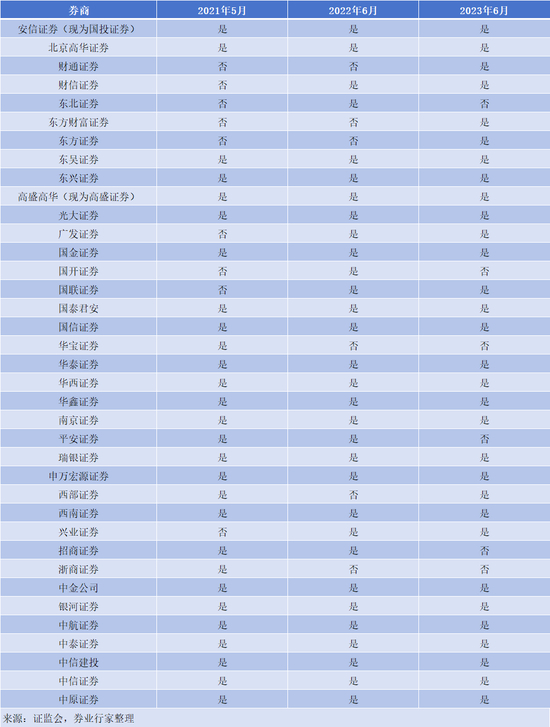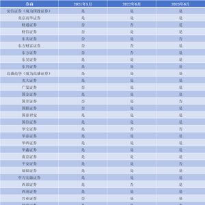 与2021年5月相比,2023年6月已累计新增7家券商——财通证券、财信证券、东方财富证券、东方证券、广发证券、国联证券、兴业证券。累计退出5家券商——东北证券、华宝证券、平安证券、招商证券和浙商证券。