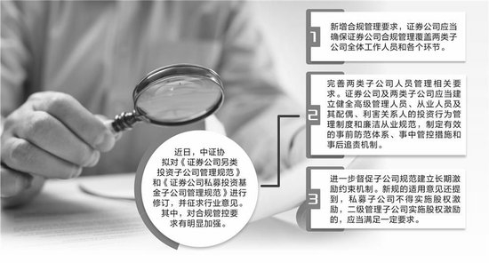 近日,证券时报记者从业内获悉,为进一步规范券商投资业务、推动券商两类子公司合规展业,防范金融风险,中国证券业协会拟对《证券公司另类投资子公司管理规范》和《证券公司私募投资基金子公司管理规范》进行修订(以下简称“新规”),并于近日征求行业意见。