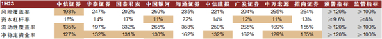 在券商核心风控指标上,2023年中金的风险覆盖率(净资本/各项风险资本准备之和)、资本杠杆率指标(核心净资本/表内外资产总额)为192.23%、11.44%,弱于其他头部公司。