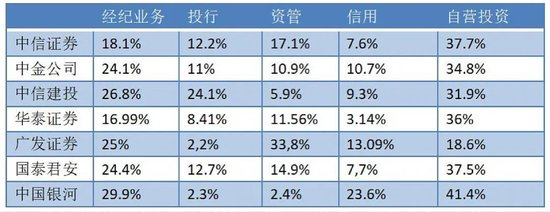 全行业来看,自营业务占比最大,超过三成;经纪业务超过两成。投行业务占到10%-15%,信用业务占比在10%以上,资管业务占比也在10%左右。