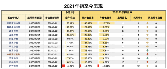 同时,不少量化管理人的业绩也开始翻红。据天风证券研报,截至3月22日,世纪前沿中性、衍复中性、明汯中性等策略产品的绝对收益率已为正值。若从2021年量化高潮算起到今年3月22日,也有致诚卓远中性、诚奇中性、黑翼中性等管理人给出了漂亮的绝对收益率。
