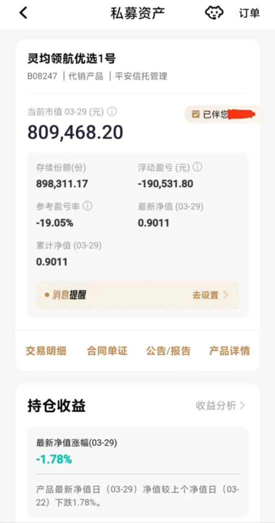 王熠也是这样。2021年7月,她在理财顾问的推荐下,买入了“灵均鑫益中证500指增”,总投资额100万元。王熠告诉‘市界’,这笔钱她原计划做长期投资,但在持有2年7个月后,因产品业绩不及预期,她只能忍痛卖出。