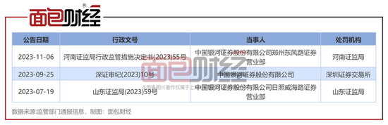 根据监管部门通报信息统计,2023年,金融监管部门向银河证券及分支机构出具3张罚单,其中证监会及证监会分局开出罚单2张、交易所开罚单1张。