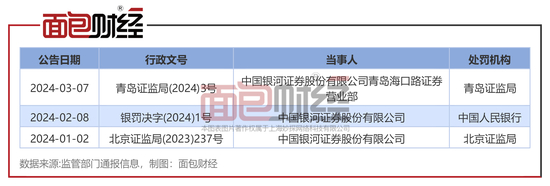 面包财经以处罚公告日统计,2024年第一季度,银河证券及分支机构收到金融监管部门出具的罚单有3张。