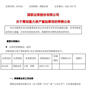 国联证券表示,本次交易构成关联交易,并预计构成重大资产重组。公司股票自今日(2024年4月26日)起停牌,预计不超过10个工作日。