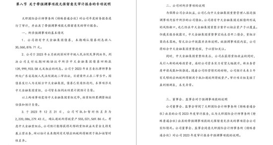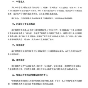 万万没想到的是,中天国富证券2023年报的审计机构天职国际会计师事务所(特殊普通合伙)(简称:天职所),出具了带强调事项段无保留意见的审计报告。