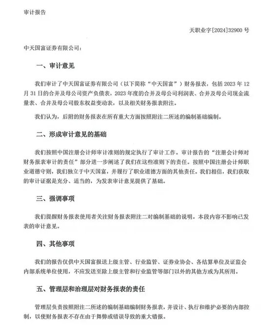 相比之下,同样是由天职所审计,中天国富证券只是“带有强调字段”,程度那可是轻多了。
