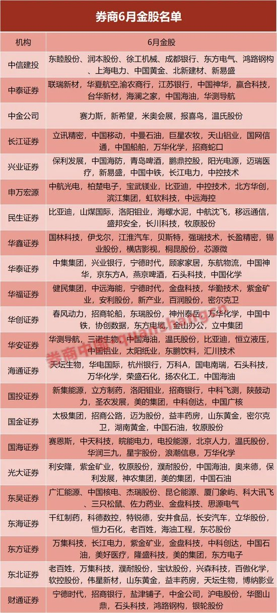 此外,6月份受到多家机构一致推荐的,还包括石油石化板块的中国海油、中国石油;电力设备板块的宁德时代、东方电缆;电子板块的工业富联、兆易创新、北方华创;有色金属板块的洛阳钼业、山东黄金等等。