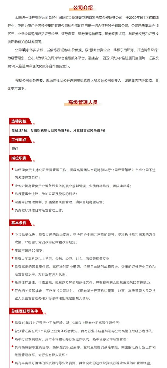 这则招聘信息显示,金圆统一证券对总经理提出了五项要求,并且特别强调需要投行业务的“资源”。