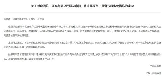 2023年2月,证监会点名金圆统一证券作为江西中天智能装备股份有限公司(简称:中天智能)创业板IPO保荐机构,未勤勉尽责履行相关职责,存在未发现发行人会计基础工作不规范情形、对疑似发行人实控人的密切联系人核查不到位、对关联关系非关联化核查不充分、对关联交易识别不到位、走访和函证存在疏漏、对费用核查不到位等问题。并对金圆统一证券及保荐代表人章侃、张忠民采取出具警示函的监管措施。