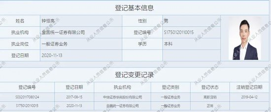 中证协从业人员信息显示,钟恒亮在2017年8月首次登记执业于当时的广州证券(现为中信证券旗下中信华南),离职于2019年4月。一年半之后的2020年11月,他登记执业于金圆统一证券。