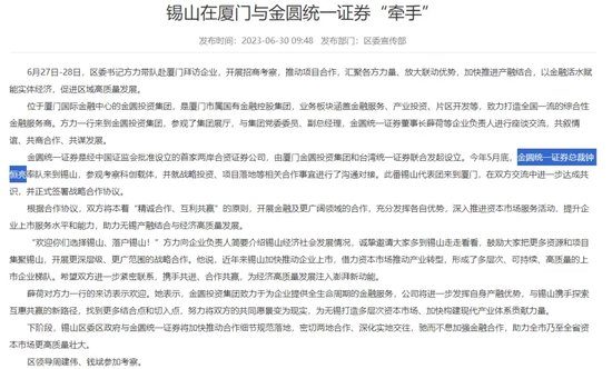 而在2023年6月,无锡市锡山区政府官网发布了一则动态称,当年5月底,“金圆统一证券总裁钟恒亮率队”来访。