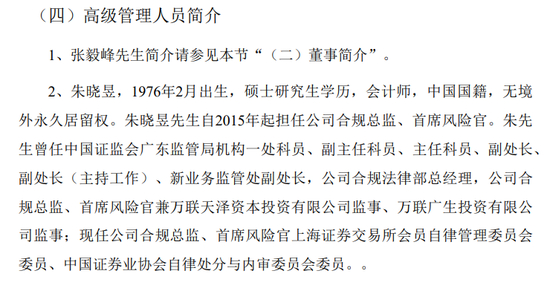 合规总监兼首席风险官朱晓昱,生于1976年,曾在广东证监局任职。目前他还兼任上交所会员自律管理委员会委员,中证协自律处分与内审委员会委员。